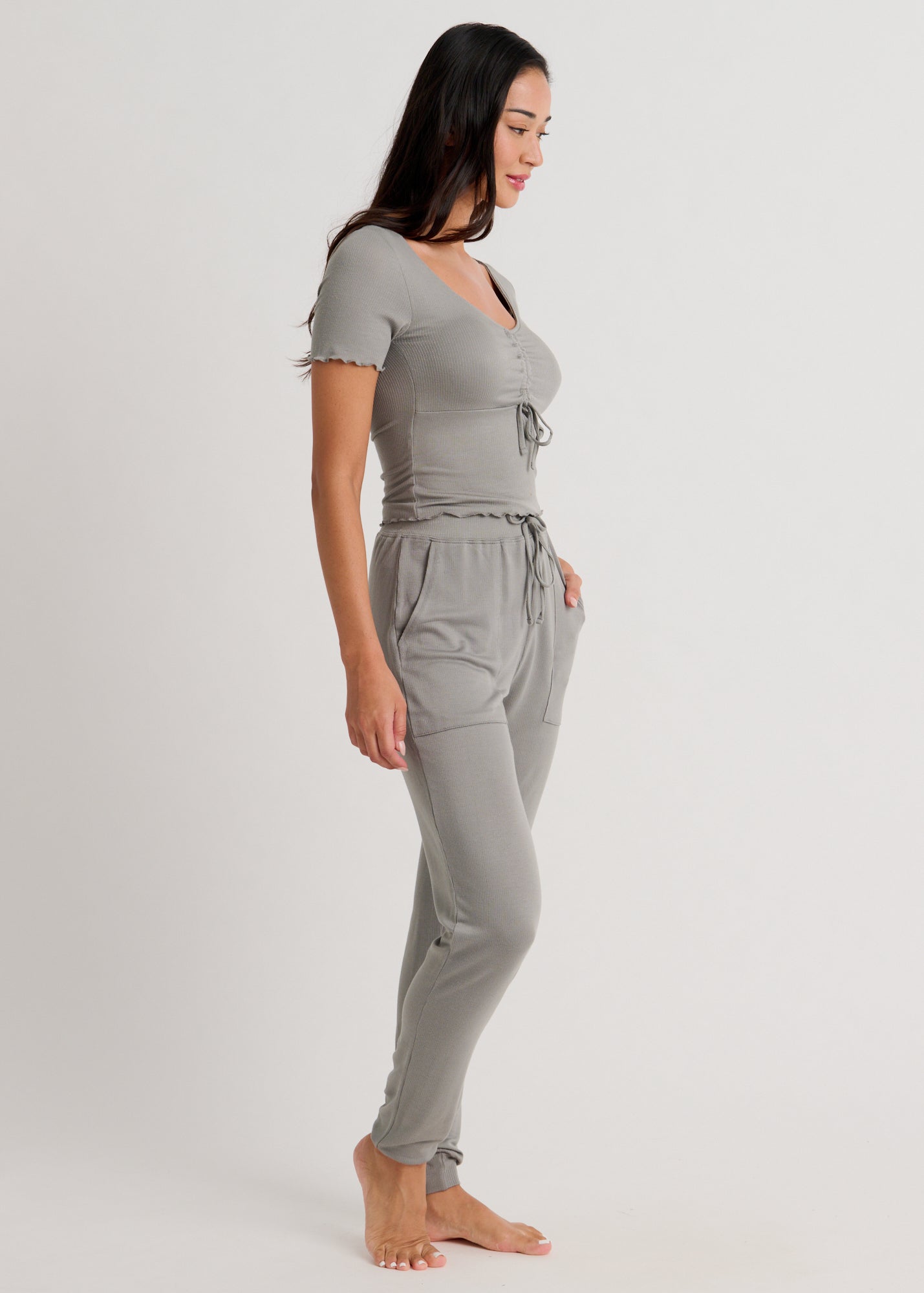 A crop top featuring the most flattering neckline and adorable frill detailing. Cute, right? Pair it with the matching leisure pants for an elevated yet effortless lounge look.
